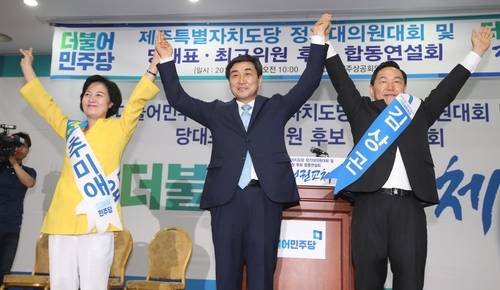 ▲더불어민주당의 8·27 전당대회가 18일 앞으로 다가온 가운데 추미애(왼쪽부터), 이종걸, 김상곤 후보 등 당권 주자들이 당심을 잡기 위해 9일 제주 상공회의소에서 열린 제주대의원대회 첫 합동연설회를 시작으로 오는 21일까지 전국의 시도당대회를 순회하며 연설회를 하는 등 ‘메시지 전쟁’에 돌입했다.(제주=연합뉴스)