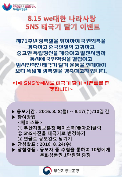 부산지방보훈청(청장 전홍범)은 오는 15일 광복절을 앞두고 광복 제71주년을 맞아 '8·15 we대한 나라사랑' SNS 태극기 달기 이벤트를 실시한다고 9일 밝혔다.