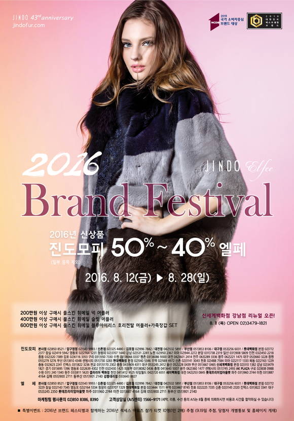 ㈜진도가 전개하는 진도모피, 엘페는 창립 43주년을 기념해 오는 12일부터 28일까지 전국 백화점 매장과 직영점에서 '2016 브랜드 페스티벌(Brand Festival)'을 개최한다고 밝혔다. 이번 행사에서 각 브랜드 신상품을 40~50% 할인한다.