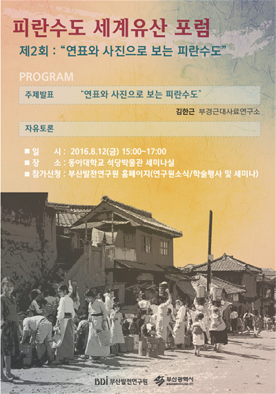 이번 포럼의 주제는 '연표와 사진으로 보는 피란수도'이다. 발제는 김한근 부경근대사료연구소 소장이 할 예정이다.