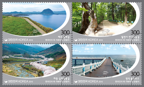 부산지방우정청(청장 정한근)은 '한국인이 꼭 가봐야 할 관광지' 시리즈 우표의 두 번째 묶음으로 아름다운 길이 돋보이는 여행지 4곳을 선정해 우표 4종, 60만장을 12일 발행한다고 밝혔다.