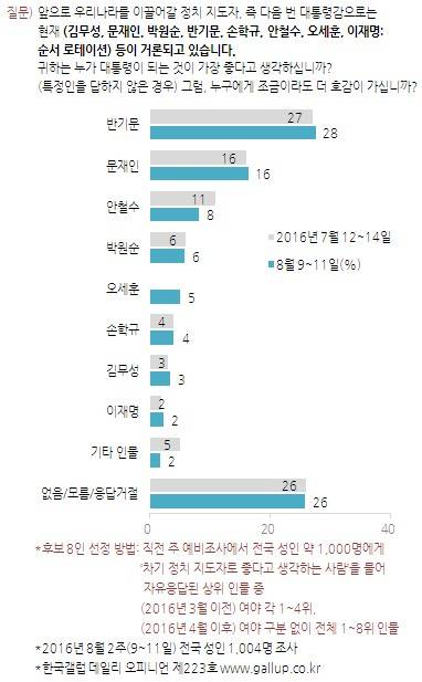 여론조사 전문기관 한국갤럽이 9~11일 전국 성인 1천4명에게 차기대선후보 지지도를 조사해 12일 발표한 바에 따르면 차기 대선후보 지지도에서 반기문 유엔 사무총장이 한달 전 조사(7.12~14)때보다 1%p 오른 28%로 계속해 3개월 연속 선두를 지켰으며, 더불어민주당 문재인 전 대표는 전달과 동일한 16%로 2위를 유지했다.