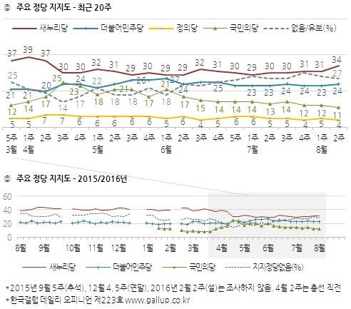 정당지지도에서는 새누리당이 전당대회 컨벤션 효과로 전주보다 3%p 급등하며 총선 후 최고치인 34%를 기록했으며, 더불어민주당은 1%p 상승한 24%로 그 뒤를 이었으나, 안 전 대표와 함께 국민의당 지지율은 계속 하락세를 보여 총선 후 최저치로 추락했으며, 정의당 4%, 없음/의견유보 27%였다.