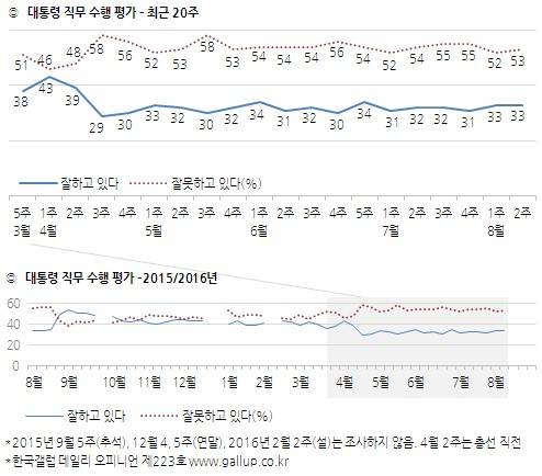 박 대통령의 직무수행 평가는 ‘잘하고 있다’는 긍정평가가 지난 주와 같은 33%로 조사됐으며, ‘잘못하고 있다’는 부정평가는 지난 주보다 1%P 오른 53%로 조사돼 됐다.