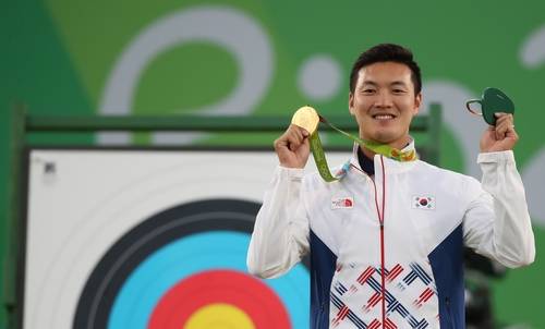 한국 남자양궁 대표팀 구본찬 선수가 13일(한국시간) 브라질 리우데자네이루 삼보드로무 경기장에서 열린 리우올림픽 양궁 남자 개인전에서 금메달을 따낸 뒤 시상식에서 환하게 웃고 있다.