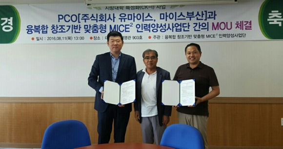 동명대학교(총장 오거돈)는 11일 오후 대학본부 경영관 903호에서 주식회사 유마이스(대표이사 김규태), 마이스부산(대표 강석호) 등 PCO 2개사와 MICE관련 학술 및 인적 교류를 위한 업무협약(MOU)를 체결했다.