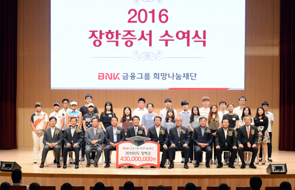 BNK금융그룹(회장 성세환)이 16일 오전 부산은행 본점 대강당에서 부산, 울산, 김해, 양산 지역 대학생과 고등학생 473명에게 총 4억 3천만원 규모의 '행복 장학금'을 수여했다.
