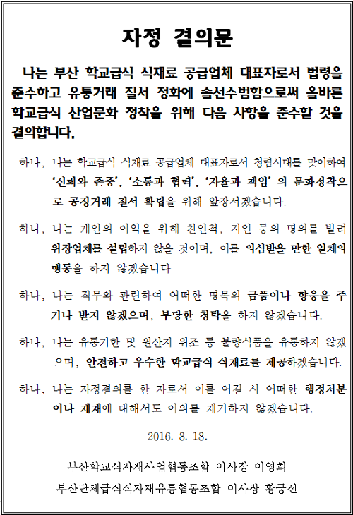 이날 결의대회 참여자들은 ▲공정거래 확립에 앞장설 것 ▲위장업체를 설립하지 않을 것 ▲직무와 관련한 금품 및 향응 수수 금지 ▲안전하고 우수한 학교급식 식재료 제공 ▲자정결의 내용 위반에 따른 행정처분 및 제재에 이의 제기하지 않을 것 등 5개항을 결의한다.