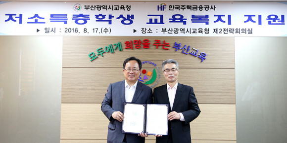 주택금융공사(사장 김재천)와 부산시교육청(교육감 김석준)은 17일 저소득층 학생 교육복지 지원을 위한 협약을 체결했다.