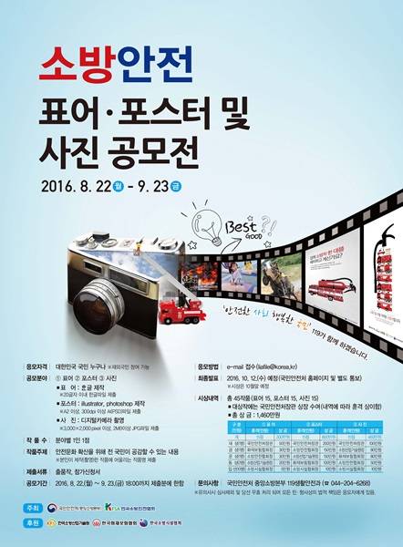 국민안전처와 한국소방안전협회가 공동 주최하는 이번 공모전은 국민들의 자율적인 안전 공감대 형성과 안전문화 확산을 위해 개최된다. 공모분야는 표어와 포스터, 사진 등 총 3개 분야이며 대한민국 국민이라면 누구나 응모 할 수 있다.