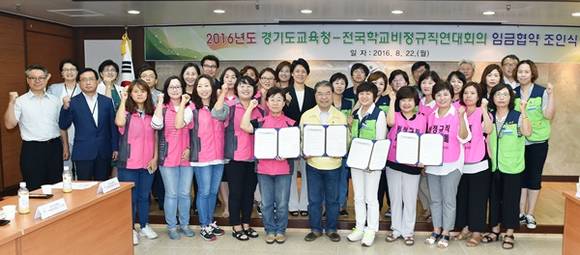 경기도교육청과 전국학교비정규직연대회의가 22일 오전 10시 경기도교육청 남부청사 신풍실에서 2016년도 임금협약을 체결했다.
