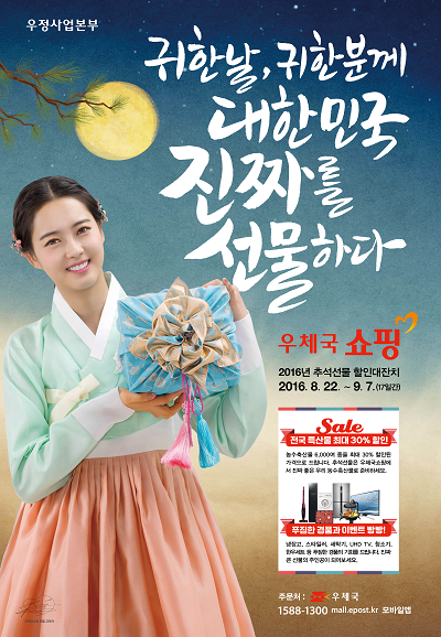 부산지방우정청(청장 정한근)은 8월 22일부터 9월 7일까지 '2016년 추석선물 할인대잔치'를 열고 6천여 종의 우리특산물을 최대 30%까지 할인 판매한다고 밝혔다.