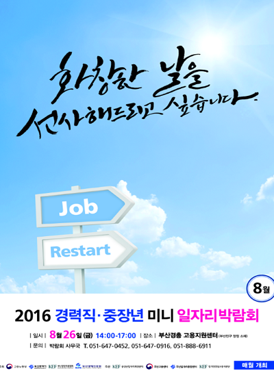 부산시가 청년층 일자리 창출과 고용촉진을 통해 청년에게 희망을 주고자 올해부터 3년간 추진하는 혁신적인 대규모 일자리 창출 사업인 '부산 일자리 르네상스 프로젝트'와 연계한 2016년 청년·중장년 미니일자리박람회를 8월 25, 26일 양일간 오후 2시부터 5시까지 부산경총 고용지원센터 13층에서 개최한다.