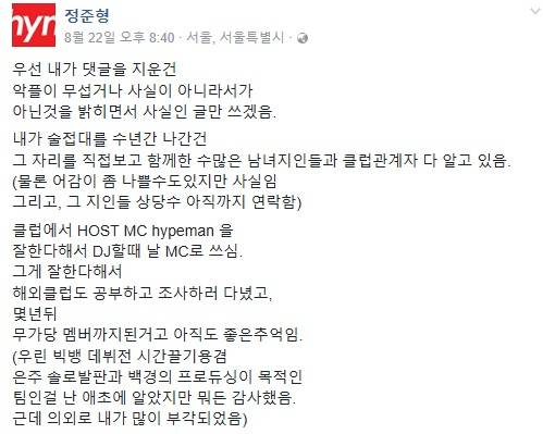 프라임은 “댓글을 지운 건 악플이 무섭거나 사실이 아니라서가 아니라 아닌 것을 밝히면서 사실만 쓰기 위해서"라고 밝힌 뒤 "내가 술접대를 수년간 나간 건 그 자리를 직접 보고 함께한 수많은 남녀지인들과 클럽 관계자들까지 다 알고 있는 사실”이라며 자신의 댓글이 거짓이 아님을 강조했다.