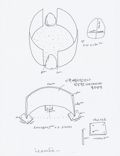 이번에 발표하게 되는 신작은 폭 6m 높이 2.3m의 비스듬한 호를 그리는 스텐레스 스틸 판이 양쪽에서 마주보고, 두 장의 마주보고 서있는 호 사이에 2m 높이의 자연석이 양쪽에서 마주보는 설치작품이다. 특히, 스텐레스 스틸 판은 거울처럼 반짝이며 반사작용을 하여, 이 작품 앞에 다가서는 관객을 비추어주는데, 관객은 판과의 거리에 따라 자신의 모습이 상하좌우로 변모하는 상호작용효과를 체험하게 되는 작품이다.