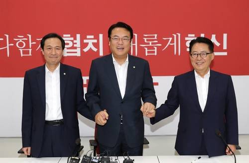 ▲새누리당 정진석(중앙)·더불어민주당 우상호(왼쪽)·국민의당 박지원 원내대표 등 여야 3당은 25일 국회에서 만나 올해 정기국회 의사일정을 놓고 협상을 벌인 결과 올해 국정감사를 추석 연휴 이후인 다음달 26일부터 오는 10월 15일까지 실시하기로 잠정 합의했다.(사진=연합뉴스)