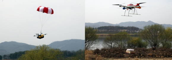 ▲CJ대한통운은 드론 추락 감지 기술 및 낙하산 자동 작동장치와 화물 자동 하강장치를 각각 세계, 국내 최초로 자체 개발하는데 성공했다. (사진=CJ대한통운)