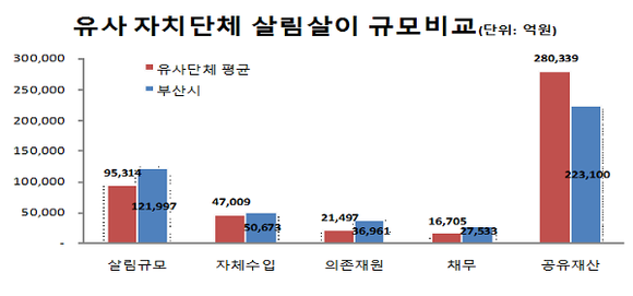 공시된 내용은 2015회계연도의 부산시 지난해 살림규모는 12조 1997억원으로 전년대비 1조 2750억원이 증가했다. 이어 비교대상인 살림규모가 유사한 지자체(서울, 부산, 대구, 인천, 광주, 대전, 울산, 세종)의 평균인 9조 5314억원보다 2조 6683억원 많은 규모이다.