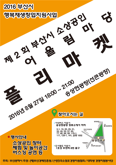 부산시는 2016년 행복재생창업지원사업에 참여한 소상공인 업체와 대학생 봉사단이 함께하는 '제2회 부산시 소상공인 어울림마당 플리마켓'을 오는 27일 오후 6시부터 저녁 9시까지 송상현광장 선큰광장에서 개최한다고 26일 밝혔다.