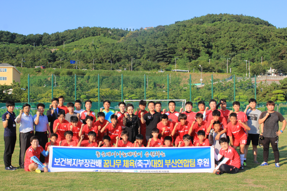 좋은데이나눔재단은 25일 부산시 남구 국민체육센터 백운포 운동장에서 유니폼과 축구화 등 축구용품을 전달하고 8월 30일 대전 월드컵경기장에서 열리는 '제18회 보건복지부장관배 꿈나무 축구대회'에 참가하는 아동축구팀 선수들을 응원했다.
