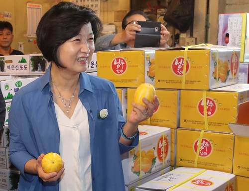 ▲제1야당인 더불어민주당의 새 수장이 된 추미애 대표가 첫 민생탐방 일환으로 30일 오전 서울 송파구 가락시장을 방문해 “땀 흘리는 민생이 보람 있는 세상을 만드는 것이 우리 정치의 목표이고 중대한 책무”라고 말하며 성주참외를 살펴보며 활짝 웃고 있다.(사진=연합뉴스)