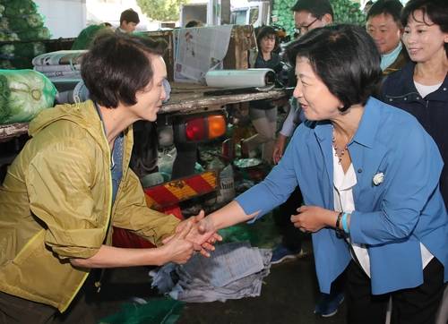 ▲더불어민주당 추미애 신임대표가 30일 오전 민생탐방을 위해 서울 송파구 가락시장을 방문해 시장 상인과 인사를 하고 있다.(사진=연합뉴스)