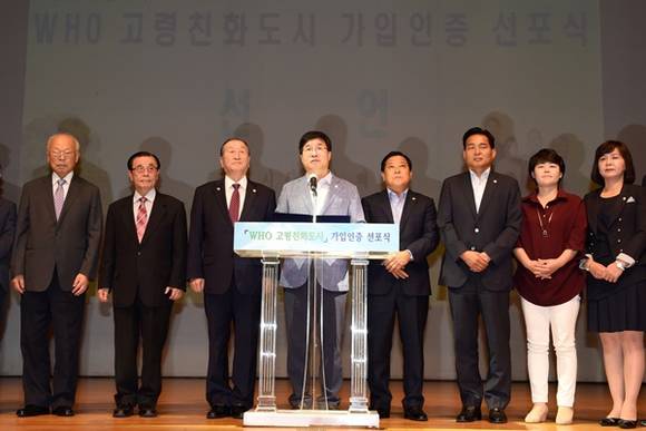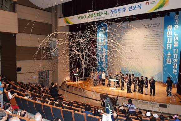 수원시가 급증하는 노인 인구의 복지 수요에 능동적으로 대처하기 위한 WHO 고령친화도시 가입인증 선포식을 30일 장안구민회관 한누리아트홀에서 가졌다.