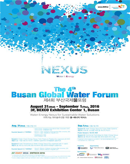 부산시가 주최하고 (사)물과 미래도시 연구소와 국제물협회(IWA)가 공동주관하는 제4회 부산국제물포럼이 8월 31일과 9월 1일 양일간 해운대 벡스코에서 개최된다.
