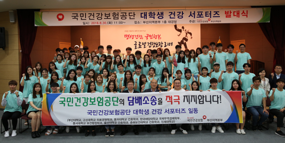 국민건강보험공단 부산지역본부(본부장 박국상)는 30일 부산·울산·경남 8개 대학 총 118명의 학생들이 참석한 가운데 대강당에서 '국민건강보험공단 대학생 건강 서포터즈' 발대식과 담배소송지지 결의대회를 개최했다.