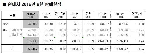현대자동차는 2016년 8월 국내 4만2112대, 해외 31만6335대 등 전세계 시장에서 지난해보다 3.1% 감소한 35만8447대를 판매했다고 1일 밝혔다.