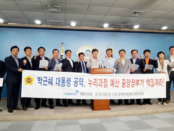 경기도의회 교육위원회 최재백 위원장(더불어민주당)과 서울시의회 교육위원회 김생환 위원장(더불어민주당)은 5일 국회 정론관에서 누리과정 문제해결을 위한 공동 기자회견을 열고 시급한 민생문제인 누리과정 해결을 위한 여·야 정치권의 즉각 회동을 촉구하고 나섰다.