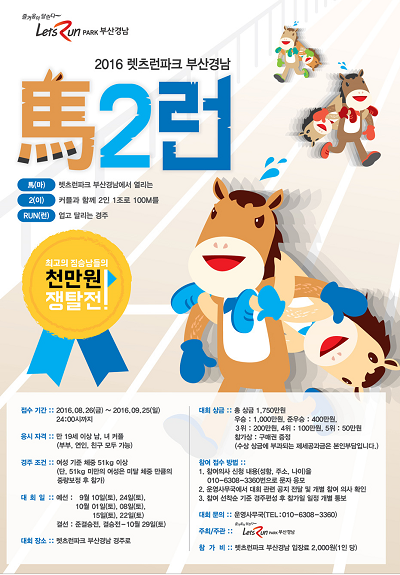 렛츠런파크 부경 황용규 경마팀장은 “평소 일반인의 출입이 철저하게 금지된 경주로에서 아내를 업고 달리는 재미있는 대회를 최초로 개최한다. 이번 대회를 통해 경마제도에 대해 직접 체험할 수 있고, 부부애를 과시하며 가을의 정취를 만끽할 수 있는 특별한 추억을 선사해 줄 것”이라며 “평소 건강관리를 해오던 대한민국 괴력남은 물론, 아름다운 추억 만들기를 바라는 이들의 많은 참여를 바란다”고 말했다.