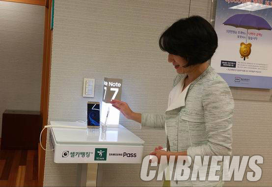 KEB하나은행도 지난달 갤노트7 출시에 맞춰 홍채인증 시스템을 도입했다. 셀카를 찍는 듯한 동작으로 홍채인증을 한다는 의미에서 서비스 명칭을 ‘셀카 뱅킹’으로 정했다.