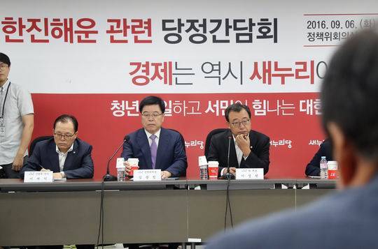 ▲6일 국회에서 열린 한진해운 관련 당정간담회. 새누리당 지도부가 김영석 해양수산부 장관의 발언을 경청하고 있다. (사진=연합뉴스)