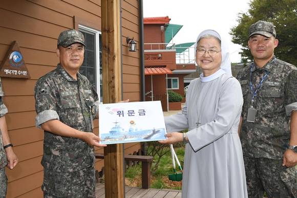 ▲해군2함대 이진환 군수전대장이 애덕가정 정애숙 원장에게 위문금을 전달하고 있다.(사진=해군2함대)