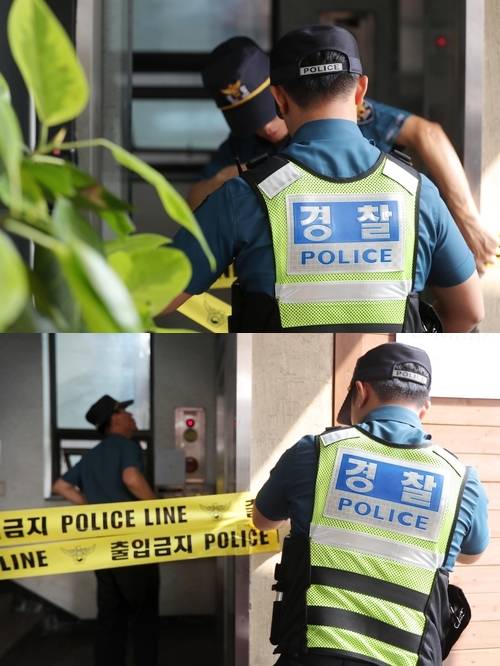 8일 하일성 야구 해설가가 숨진 채 발견된 가운데 경찰이 서울 송파구에 소재한 하씨의 사무실 앞에서 출입을 통제키 위한 폴리스 라인을 치고 있다.
