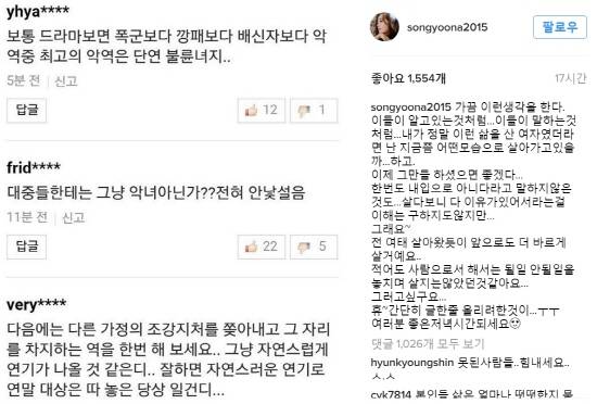 23일 첫 방영되는 tvN 드라마 ‘THE K2’에 송윤아의 출연 소식이 전해지자 “보통 드라마 보면 폭군보다 깡패보다 배신자보다 악역 중 최고의 악역은 단연 불륜녀지”, “대중들한테는 그냥 악녀 아닌가?”, “조강지처를 쫒아내고 그 자리를 차지하는 역을 한번 해 보세요. 그냥 자연스럽게 연기가 나올 것” 등의 악성댓글이 달렸다.