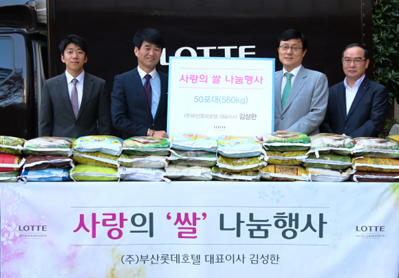 김성한 (주)부산롯데호텔 대표이사는 8일 오전 10시 롯데호텔부산 정문에서 '사랑의 쌀 전달식'을 열고, (재)한결재단에 쌀 560kg을 기부했다.