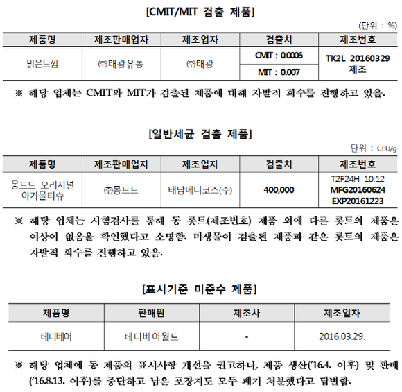 먼저 살균·보존제 함유 여부를 검사한 결과, 조사대상 27개 중 26개 제품은 안전기준에 적합했다. 하지만 태광유통(제조사 태광)의 맑은느낌 물티슈 1개 제품에서 CMIT(메칠클로로이소치아졸리논) 0.0006%, MIT(메칠이소치아졸리논) 0.007%가 검출된 것.
