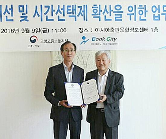 고용노동부 고양지청(지청장 김영규)은 지난 9일 아시아출판문호정보센터에서 (사)출판도시입주기업협의회와 파주출판단지의 건강한 근로환경 조성 및 시간선택제 확산 등을 위한 업무협약식을 체결했다고 밝혔다.
