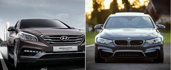 ▲BMW(오른쪽)는 현대차 쏘나타 보다 3∼4배 가량 비싸지만 두 차량의 자동차세는 동일하다.