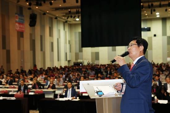 ▲최성 고양시장이 킨텍스에서 개막한 스마트시티 이노베이션 서밋 아시아에서 기조 연설을 하고 있다(사진= 고양시)