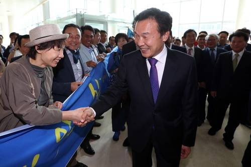 ▲더불어민주당 손학규 전 상임고문(가운데)이 20일 오후 전남 강진군 강진아트홀에 들어서며 지지자와 악수하고 있다. 손 전 대표는 이날 '손학규가 바라본 강진 희망'이라는 주제로 다산강좌 강연을 진행했다.(강진=연합뉴스)