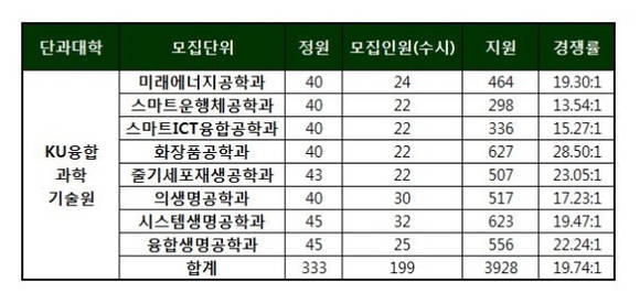 KU융합과학기술원의 각 학과별 수시모집 5개 전형 통합 경쟁률은 미래에너지공학과 19.30대1, 스마트운행체공학과 13.54대1, 스마트ICT융합공학과 15.27대1, 화장품공학과 28.50대1, 줄기세포재생공학과 23.05대1, 의생명공학과 17.23대1, 시스템생명공학과 19.47대1, 융합생명공학과 22.24대1 등이다.