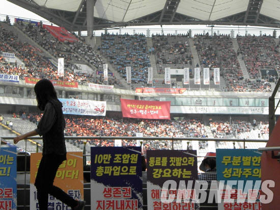 오전 9시부터 상암월드컵경기장에 모여든 이들은 각 지부별로 운동장과 관중석에서 질서정연하게 배석해 ‘해고연봉제 저지’, ‘관치금융 철폐’ 등의 피켓과 현수막을 걸고 구호를 외쳤다.