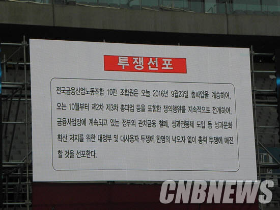 김문호 금융노조위원장은 “성과연봉제 저지, 노동탄압 분쇄, 관치금융 철폐를 위한 금융노동자 9.23 총파업을 선포한다”며 “대한민국 노동자들을 위해 성과연봉제를 반드시 막아내 승리의 함성을 지르겠다”고 목소리를 높였다.