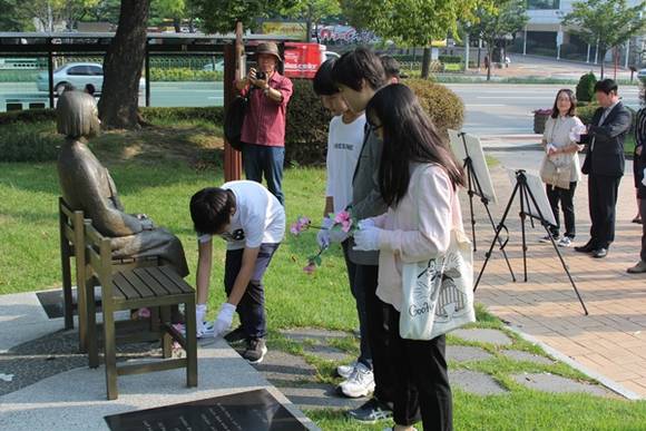 이날 학생들과 관계자 30여명은 올림픽공원에 있는 ‘수원 평화의 소녀상’에 헌화하고 소녀상 주변 환경을 정비했다.