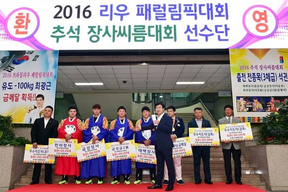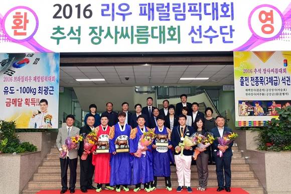 수원시는 26일 시청 본관 로비에서 2016 추석 장사씨름대회와 브라질 리우 패럴림픽대회에서 우수한 성적을 거둔 선수단에 대한 환영식을 가졌다.