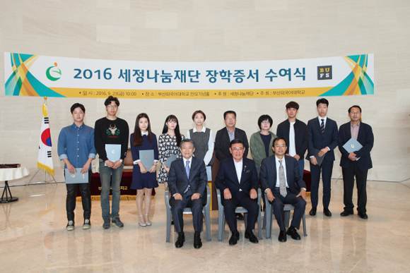 세정그룹의 사회복지법인 세정나눔재단(이사장 박순호)이 부산외대 재학생 10인에게 장학금 1500만원을 전달하는 장학증서 수여식을 가졌다.