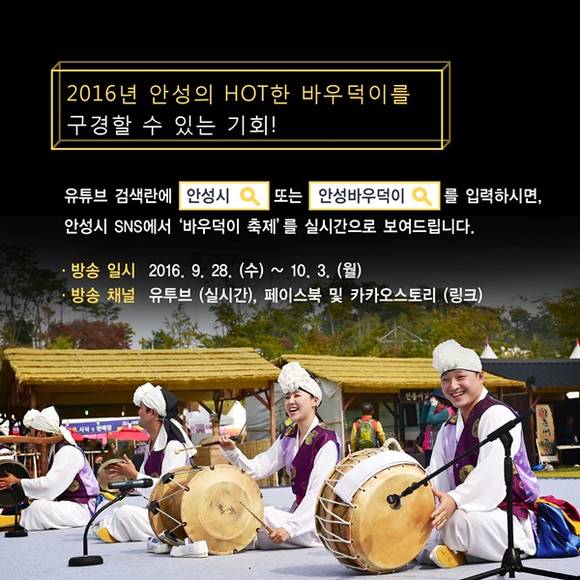 올해로 16회째를 맞이하는 대한민국 대표 전통문화예술축제 2016안성맞춤남사당바우덕이축제의 다양한 공연 현장이 유튜브를 통해 실시간으로 공개된다.